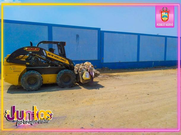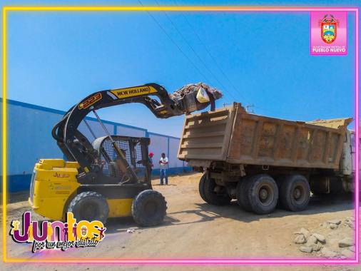 Esta mañana, 01 minicargador y 02 volquetes de 15 mts. cúbicos ejecutaron el recojo de residuos sólidos y escombros en el perímetro de la Institución Educativa 9 de Diciembre.