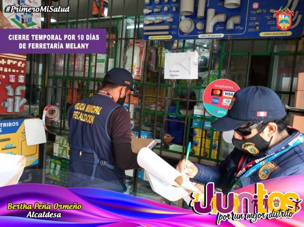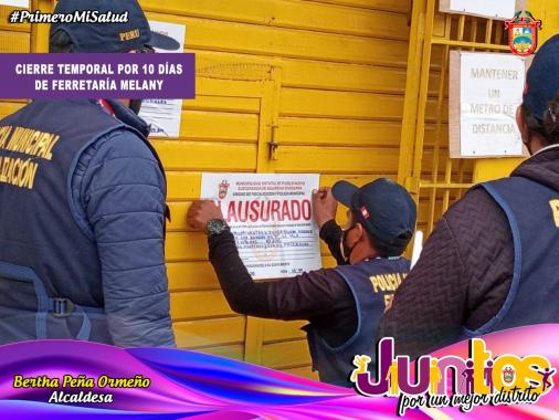 La sanción también abarca una multa económica del 40 % de una UIT, complementando al cierre temporal por 10 días de ambos negocios (Ferreterías). Este trabajo se viene ejecutando con el más estricto cumplimiento de Ordenanzas Municipales, de acuerdo a lo dispuesto por la autoridad edil, con el único objetivo de regularizar los comercios y el buen desempeño de estos en la sociedad.