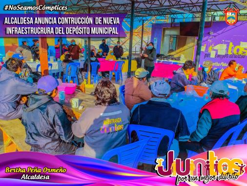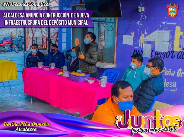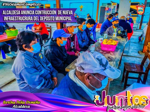 Las autoridades ediles se dieron cita a las 6:00 a.m. que es precisamente la hora de ingreso del personal del área de "SERVICIO PÚBLICO", el mismo que comprende (LIMPIEZA PÚBLICA, CHÓFERES DE VEHÍCULOS MENORES Y MÁQUINAS PESADAS, MAESTRANZA, entre otros), para así poder confraternizar y anunciar las buenas nuevas que tiene la gestión municipal, todo ello con la finalidad de que las personas que que laboran en el DEPÓSITO MUNICIPAL, puedan tener un local en mejores condiciones para poder laborar y al mismo tiempo contar con el espacio necesario para el resguardo y mantenimiento de las maquinarias pesadas, que están bajo responsabilidad de dicho lugar para el servicio de la población. Cabe señalar que dicho DEPÓSITO MUNICIPAL alberga a más de un centenar de trabajadores obreros municipales, que desde el inicio de la PANDEMIA, también estuvieron en primera línea, trabajando en favor de la comuna.