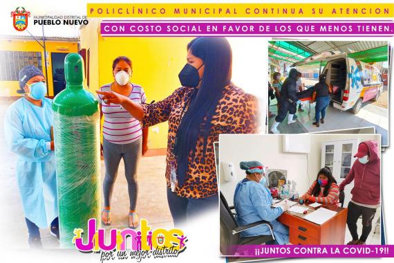 El centro médico municipal a cargo del Lic. Obstetra ÁNGEL MACAZANA ORDOÑEZ; beneficia a miles de pobladores del distrito de Pueblo Nuevo, así como también de otras localidades. El trabajo del POLICLÍNICO MUNICIPAL, se ha convertido en un aliado bastante importante para mejorar y cuidar la salud de todos, más aún cuando muchos de nuestros vecinos no tienen las posibilidades de ir a clínicas privadas y pagar por exámenes médicos demasiado costosos.