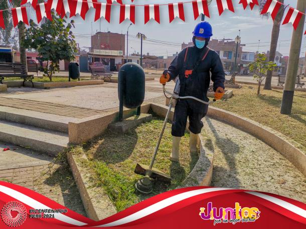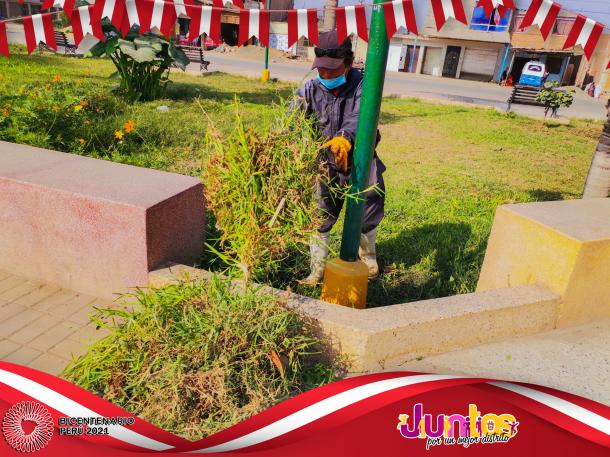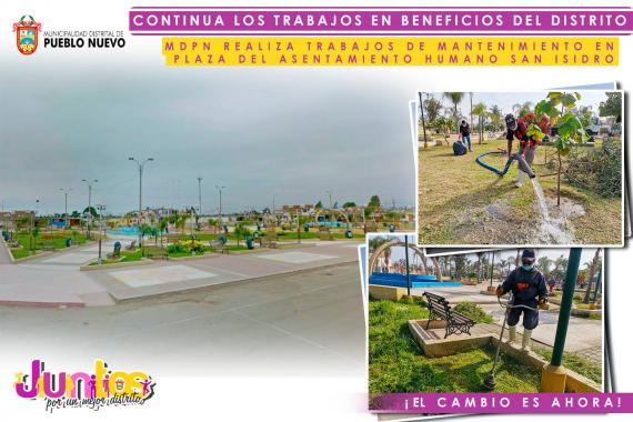 La Municipalidad Distrital de Pueblo Nuevo, a través de la Unidad de Limpieza Pública, Parques y Jardines, realizaron el mantenimiento del Parque principal del Asentamiento Humano SAN ISIDRO, con la finalidad de mantener el cuidado y la limpieza de estos espacios, muy importantes para la conservación del medio ambiente.