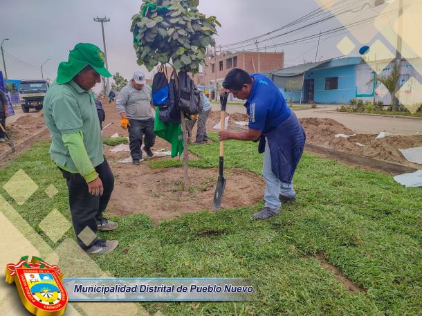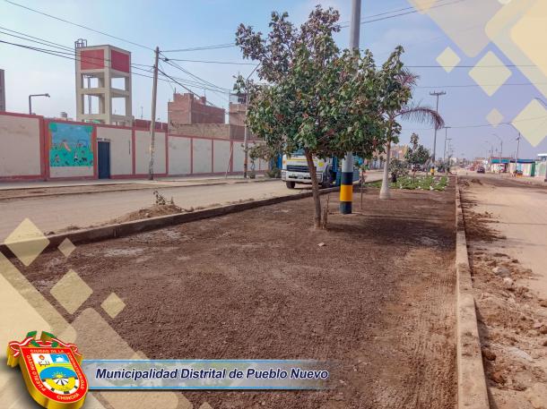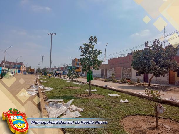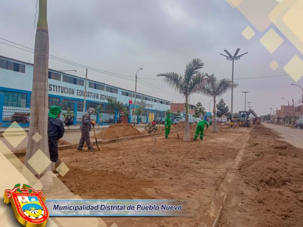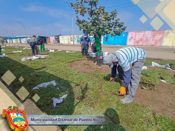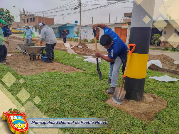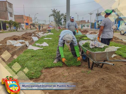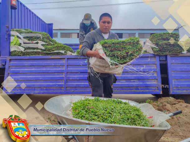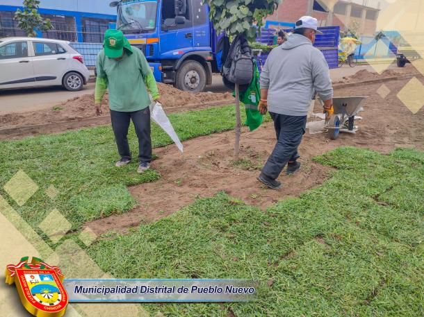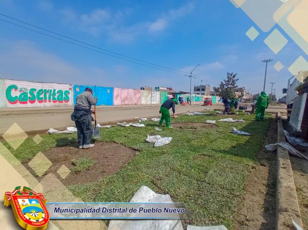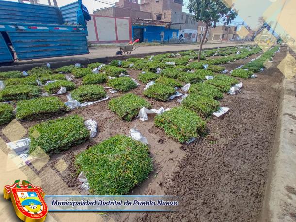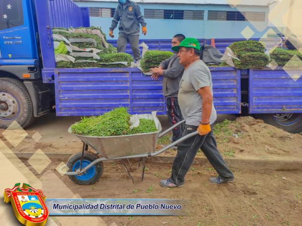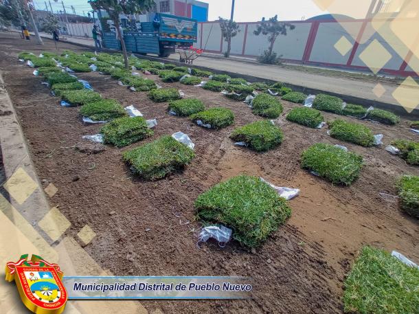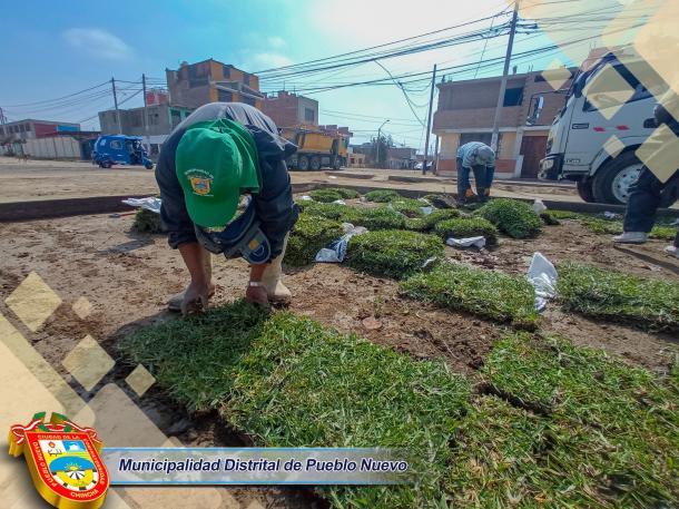 De acuerdo a lo prometido por la alcaldesa Sra. Bertha Peña Ormeño, la Municipalidad de Pueblo Nuevo continúa realizando los trabajos de sembrado de grass en la Av. 13 de Octubre, trabajo que viene realizando el propio personal calificado de la Unidad de Parques y Jardines, esto con el objetivo de mejorar el ornato de la ciudad y el medio ambiente con las plantas que en los próximos días se estarán sembrando.