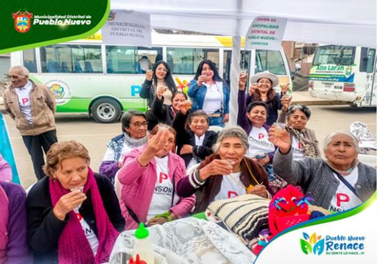 La delegación de Pensión 65, integrado por personas de la tercera edad del distrito de Pueblo Nuevo, participó de los SABERES PRODUCTIVOS en el distrito de Sunampe. La delegación estuvo integrada por el subgerente de desarrollo social, Mg. Carlos Núñez Lurita y la Lic. Shirley Ruiz Orihuela, quienes se presentaron con las señoras con manualidades de tejido, bordados, dulces, platos fríos, entre otros productos.