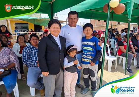El evento contó con la presencia del alcalde del distrito, Ing. William Sánchez Cahuana, la regidora Julia Portilla y Justina Román, presidenta del asentamiento. También asistieron funcionarios de la municipalidad de Pueblo Nuevo, dirigentes de la parte alta y representantes de la I.E. Satélite Primaveral, además de numerosos vecinos que celebraron juntos este significativo aniversario.