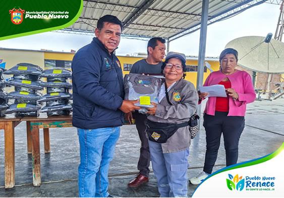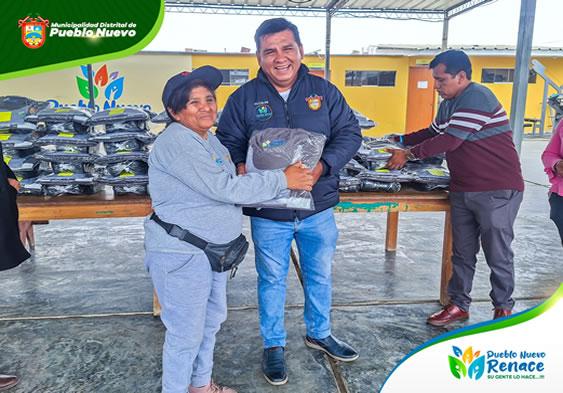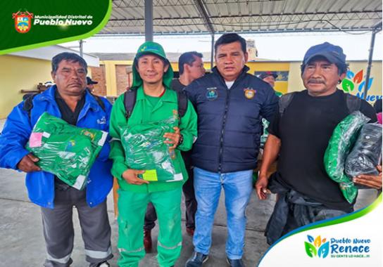 El Ing. William Sánchez Cahuana, alcalde del distrito de Pueblo Nuevo, llevó a cabo la entrega de implementos de vestimenta a los trabajadores de diversas áreas de la municipalidad que desempeñan su labor en el depósito municipal.